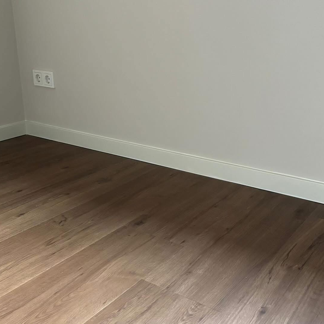 Hier hebben we een mooie PVC walvisgraat gelegd van het merk Room5 en afgewerkt met een mdf plint.