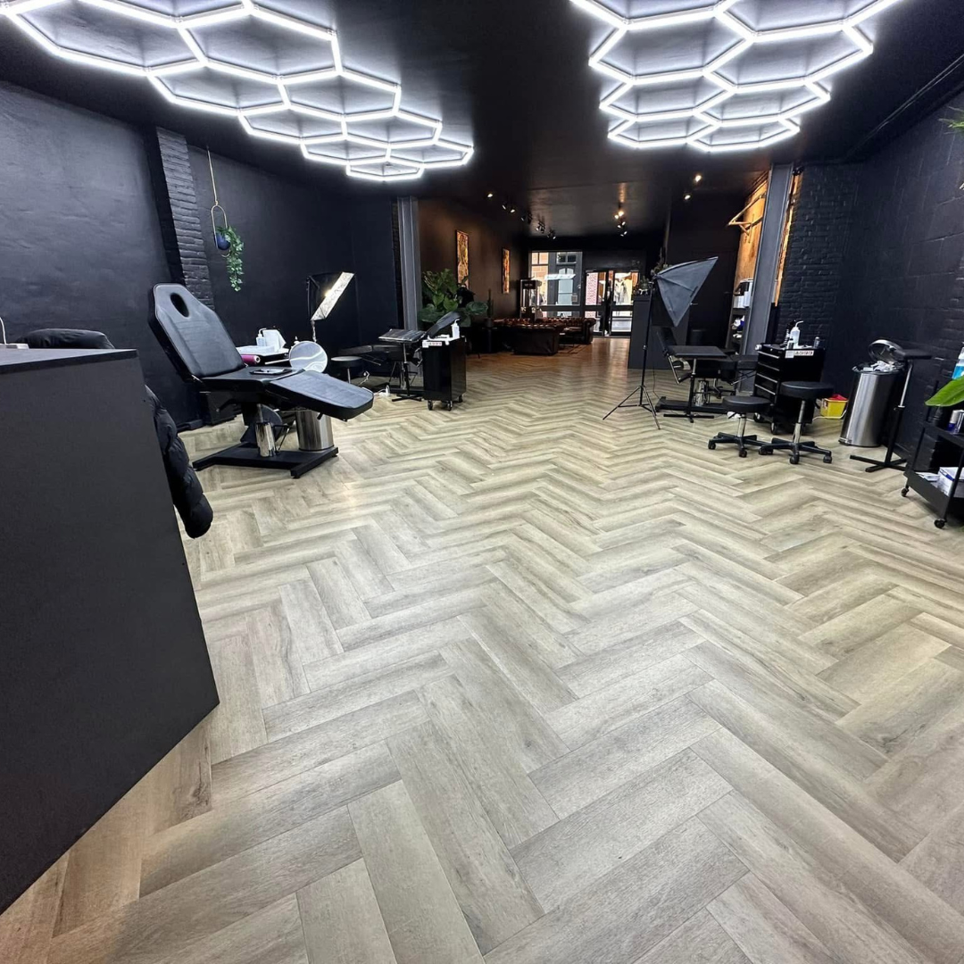 Bij goons & Queens mochten wij een mooie pvc vloer visgraat leggen en afwerken met een zwarte mdf plint.